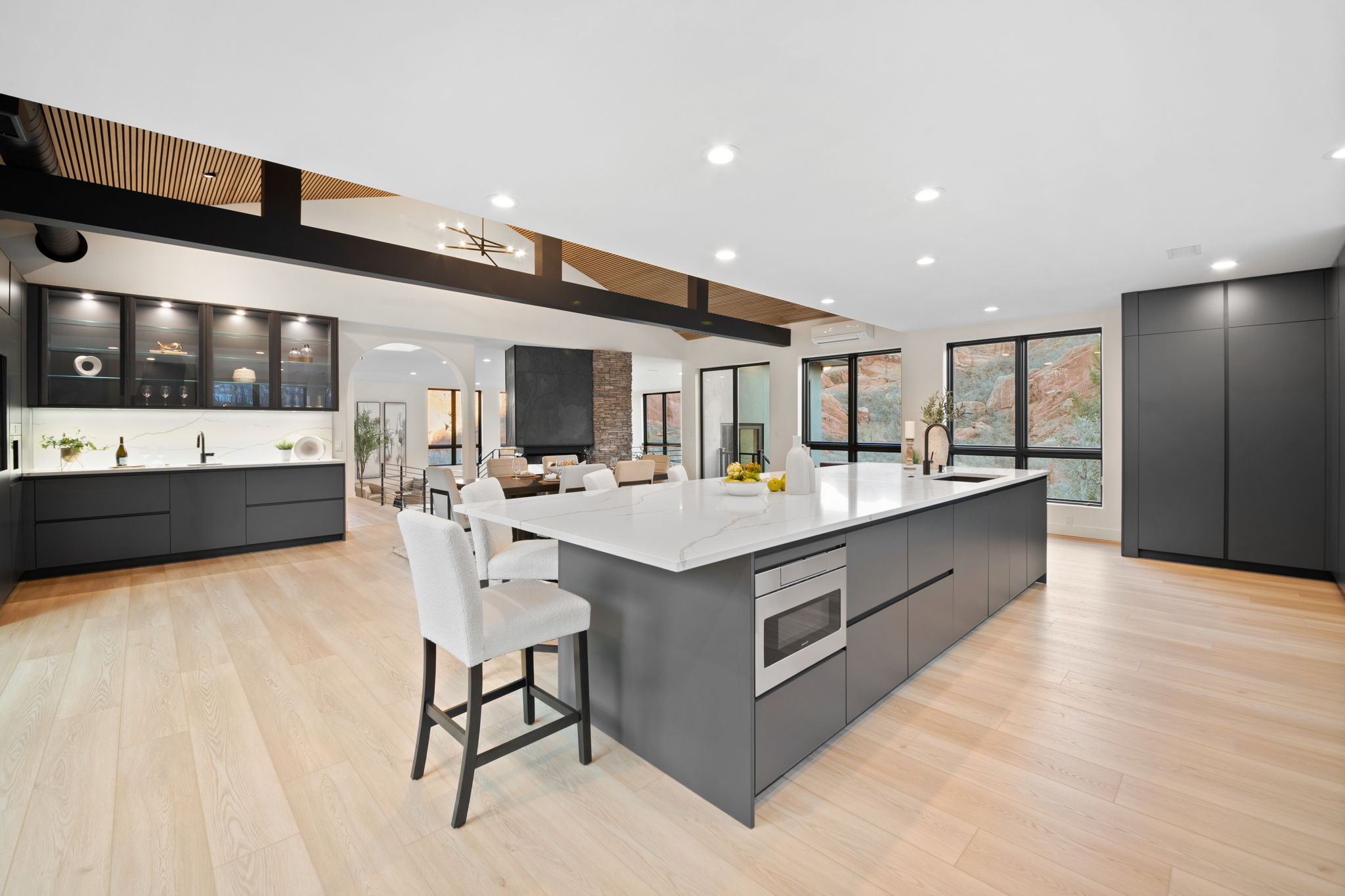Every detail is custom, every space designed with intention. The gourmet kitchen showcases a 14-foot island, induction cooking with hidden ceiling vent, integrated appliances, pot filler, full-height pantry walls with pull-outs, and a beverage center with wine storage and built-in espresso. Vaulted ceilings and a dramatic four-sided fireplace define the dining and great room, creating a showstopping centerpiece for everyday living and unforgettable entertaining.