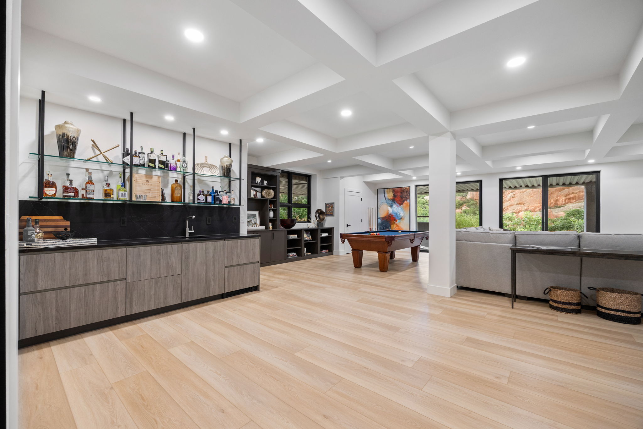 Walkout level features a wine cellar, designer wet bar, and coffered ceilings for stylish hosting.